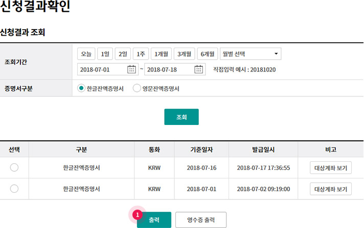 Step 2. 조회된 신청결과에 따라 증명서 출력이 가능합니다.