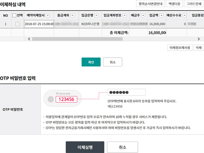 Step 3. 예약이체신청내용을 확인하고, OTP번호 및 인증서암호를 입력합니다.