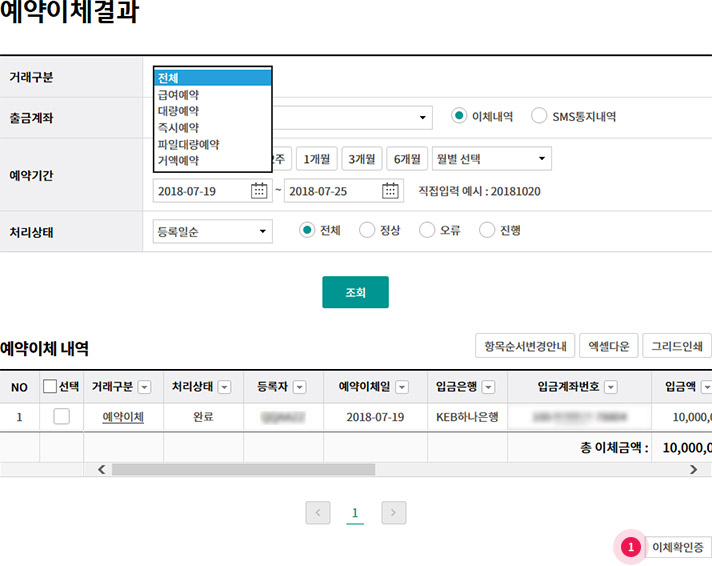 • ① 계좌선택 후 이체확인증 조회 및 출력 가능