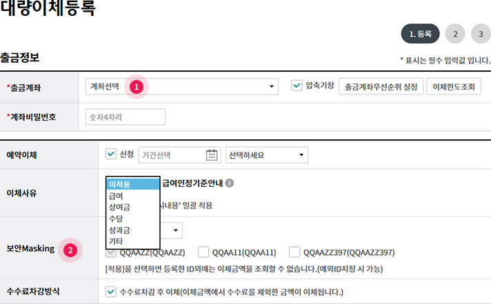 Step 1. 출금정보 입력 후 예약이체, 보안Masking 등 옵션을 지정할 수 있습니다.