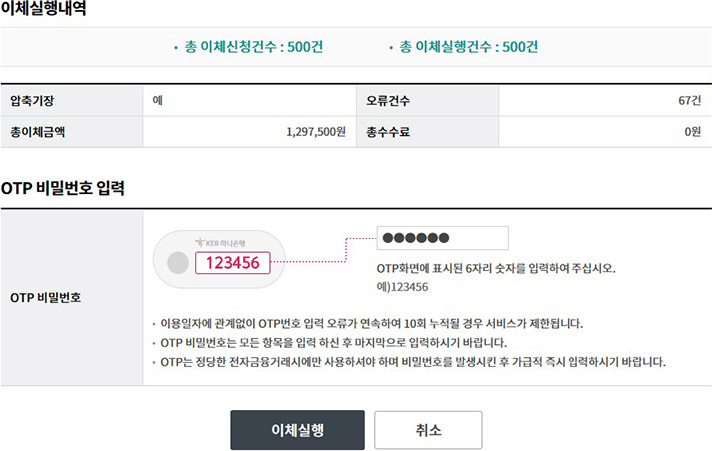 Step 4. OTP비밀번호와 인증서 암호를 투입하여 대량이체를 실행합니다.