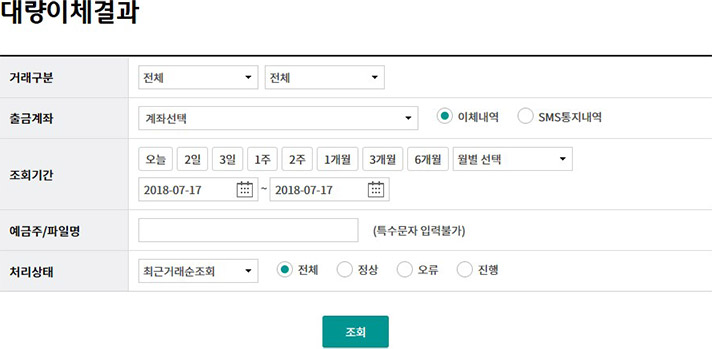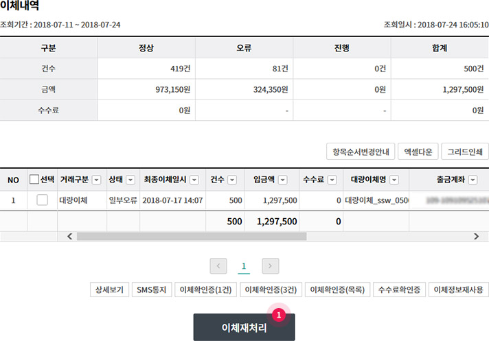 Step 2. 대량이체결과 조회 및 이체 재처리 합니다.