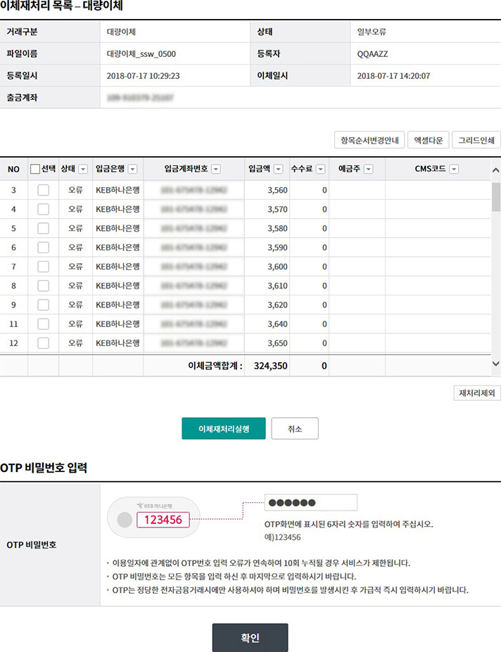 Step 3. 이체재처리실행 후 OTP, 인증서 암호를 입력 후 확인합니다.
