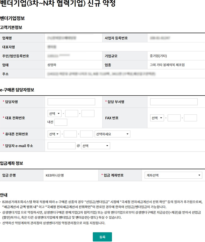 Step 1. 담당자정보 및 입금계좌번호를 입력한 후 등록 버튼을 클릭합니다.