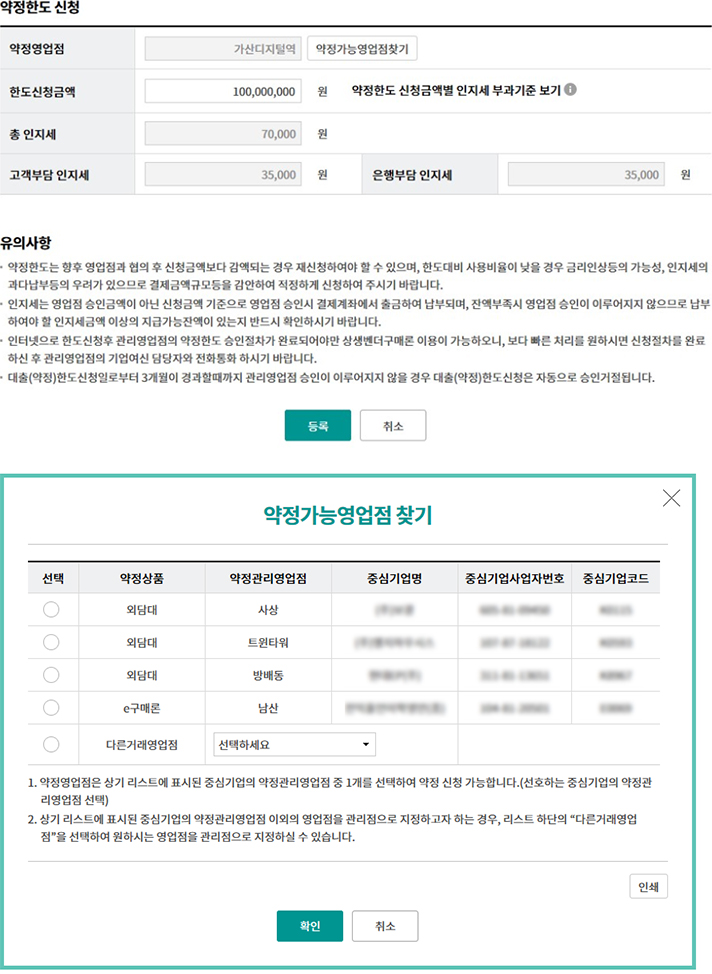 Step 3. 약정가능영업점찾기를 클릭하여 약정영업점을 선택한 후 한도신청금액을 입력합니다.