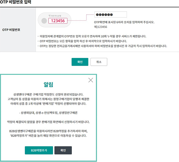 Step 5. OTP 비밀번호 및 인증서 암호를 입력후, 약정한도신청완료 팝업내용을 확인합니다.