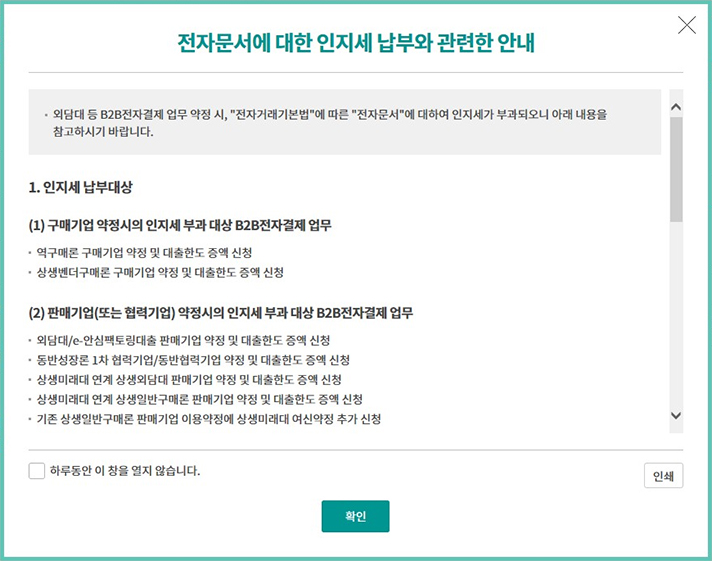 Step 1. 전자문서에 대한 인지세 납부와 관련한 안내를 읽고 확인 버튼을 클릭합니다.