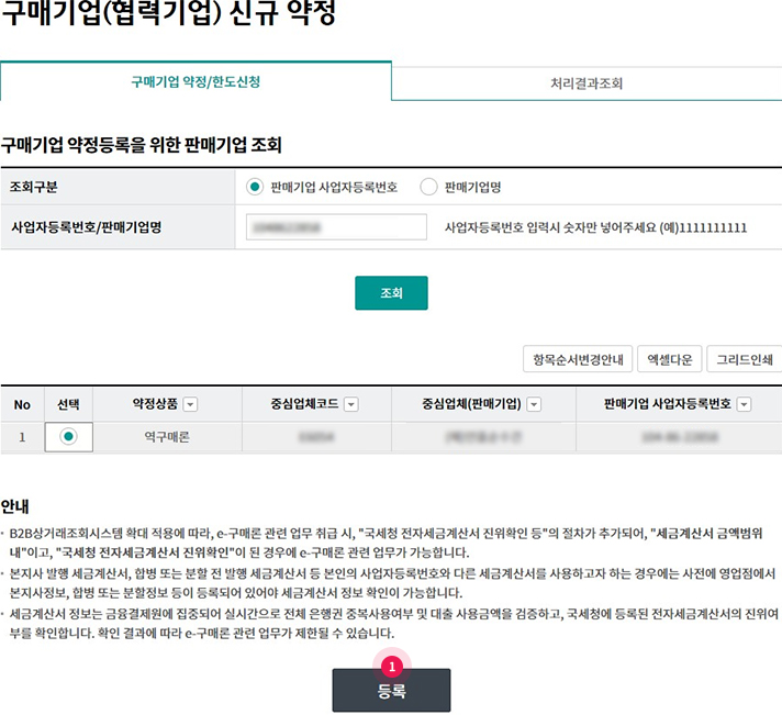 Step 2. 판매기업 사업자등록번호 또는 판매기업명을 입력 후 조회 버튼을 클릭합니다.