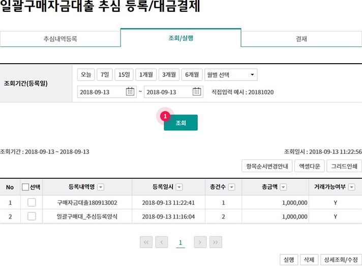 ① 조회된 내역 선택 후 실행, 삭제, 상세조회가 가능합니다. (상세조회 후 수정가능)