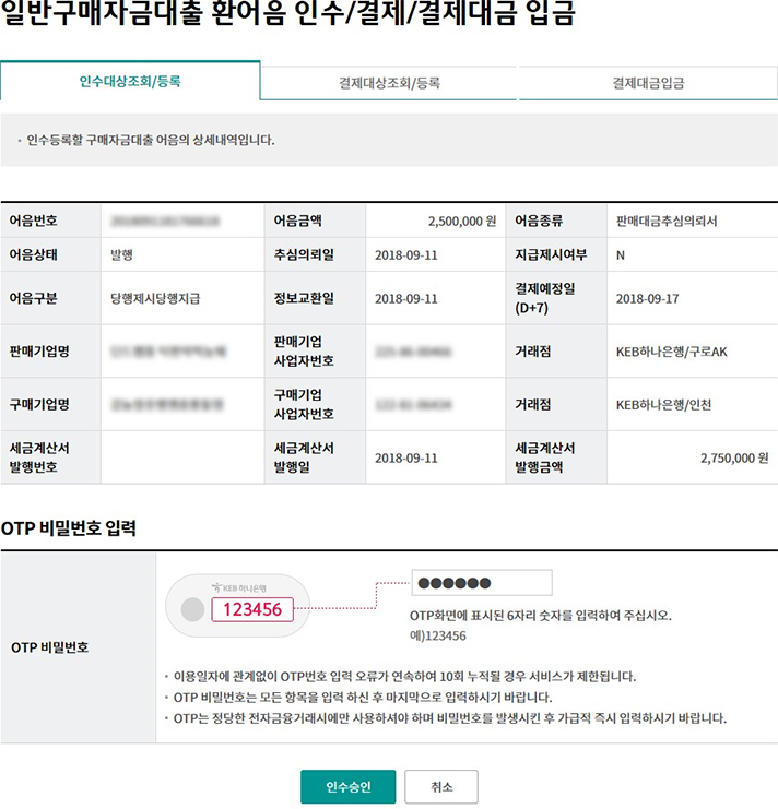 Step 2. 어음의 상세내역을 확인한 후 OTP 비밀번호 및 인증서 암호를 입력합니다.