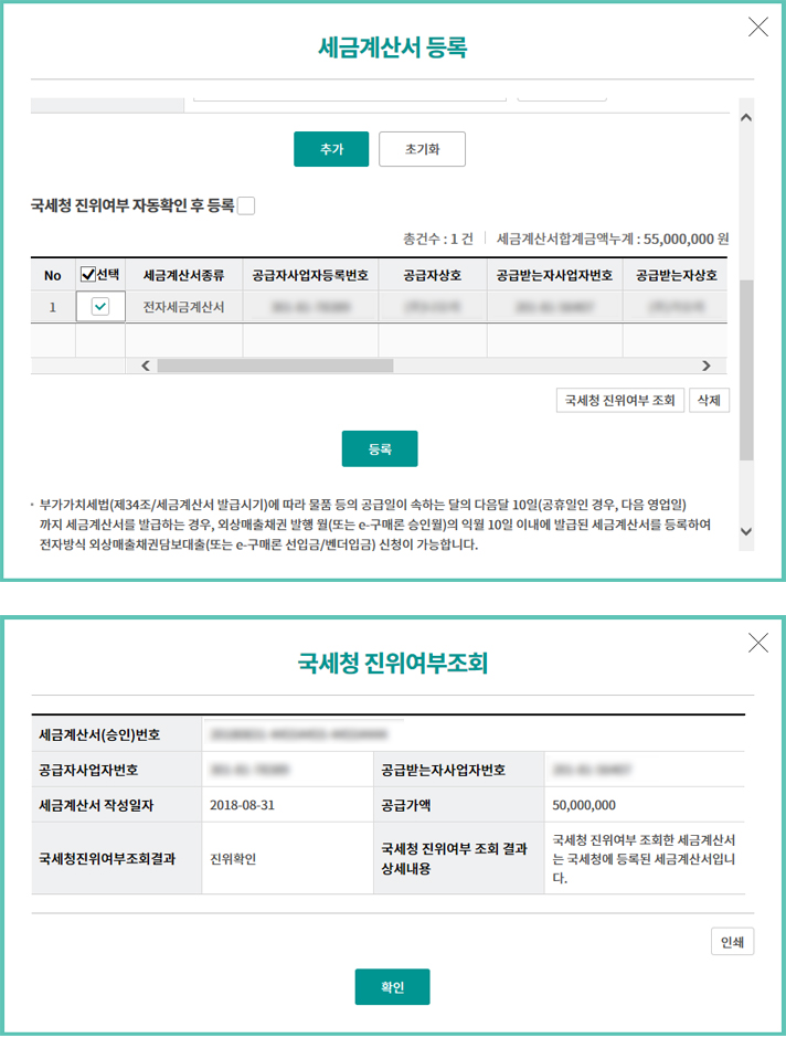 Step 8. 추가된 세금계산서의 국세청 진위여부를 확인합니다.