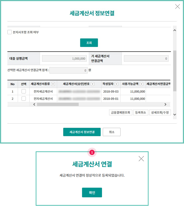 Step 10. 조회된 세금계산서를 선택한 후 금융결제원조회 버튼을 클릭합니다.
