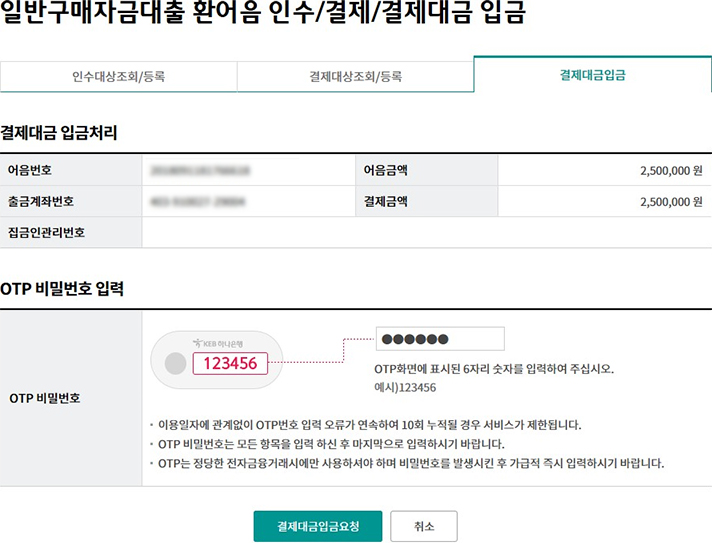 Step 11. 대출실행정보를 확인한 후 OTP 비밀번호 및 인증서 암호를 입력합니다.