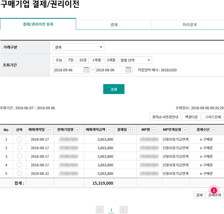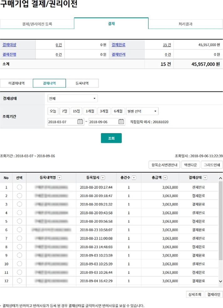 Step 7. 미결재내역/결재내역/등록내역 중 원하시는 거래를 선택 후 조회버튼을 클릭합니다.