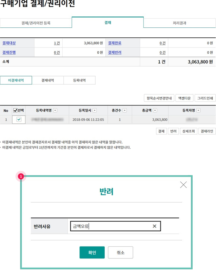 Step 10. 미결재내역 건을 클릭하여 결재 또는 반려처리가 가능합니다.