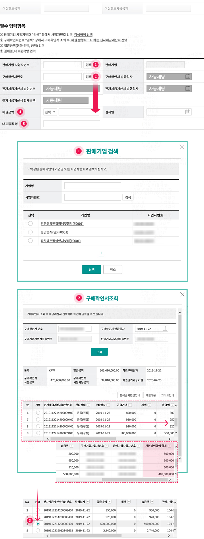 • 1. 채권 발행하고자 하는 전자세금계산서 선택 시, “구매확인서 번호/발급일자” & 전자세금계산서 승인번호/ 발행일자/ 합계금액”은 자동 세팅됨