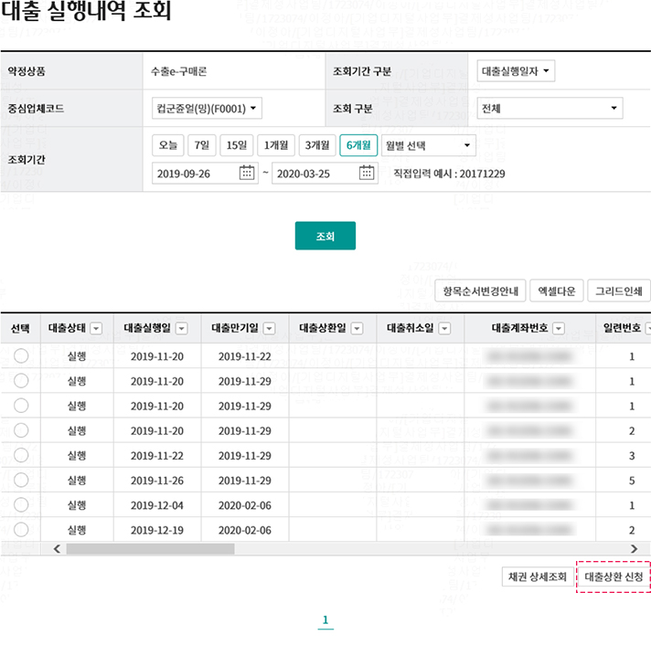 • 1. 수출e-구매론 대출 실행 내역 조회 가능함