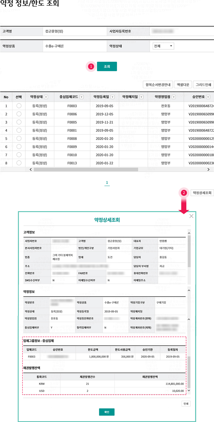 • 2. 약정 건 별 약정 상세조회 가능함(채권발행 잔액 포함 조회 가능)