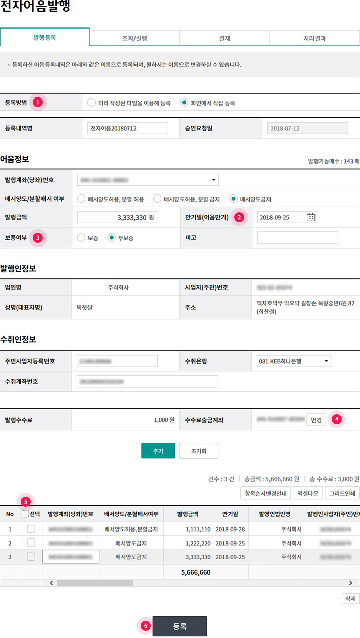 Step 1. 전자어음발행 발행등록화면에서 내용을 입력 후 등록단계로 이동합니다.