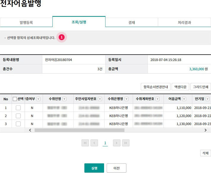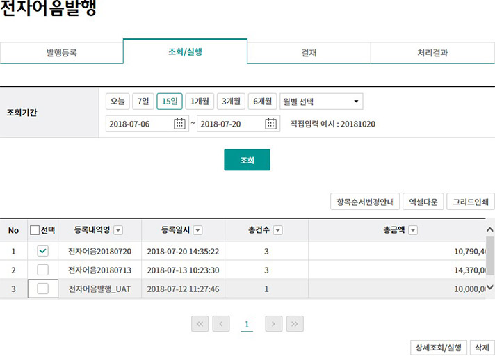 Step 3. 등록 내역을 조회후 실행버튼을 클릭합니다.