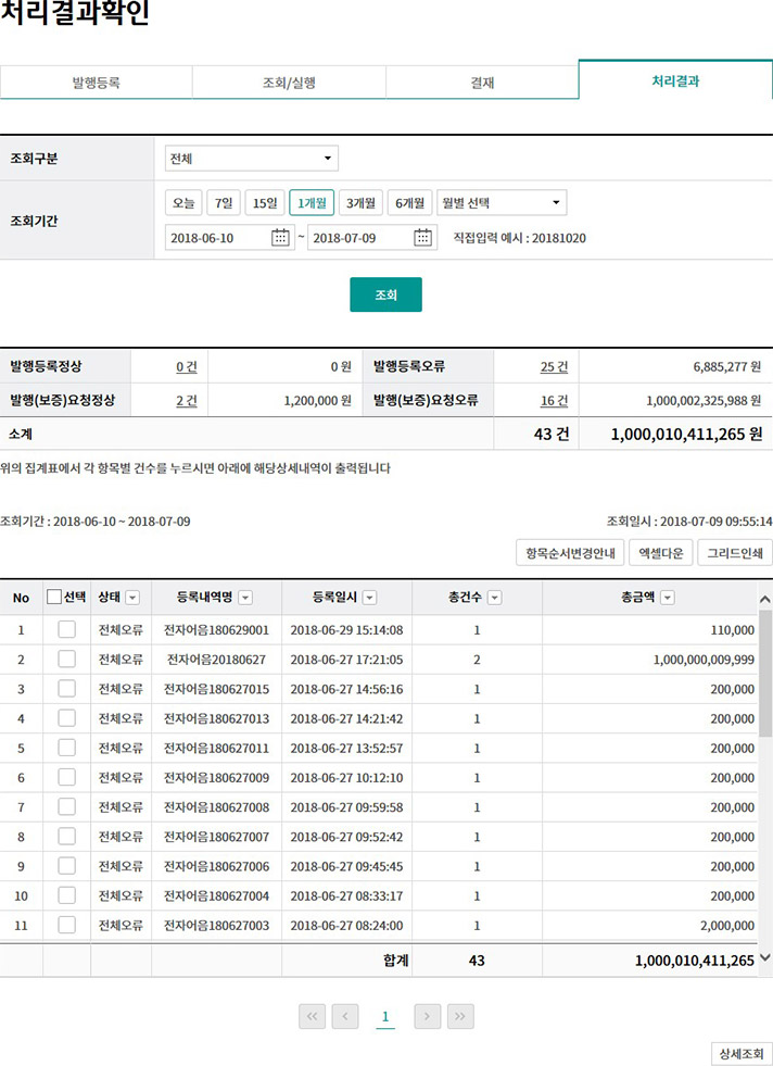 Step 5. 처리결과확인 화면에서 조회조건을 투입하면 기간별로 결과값을 조회하실 수 있습니다.