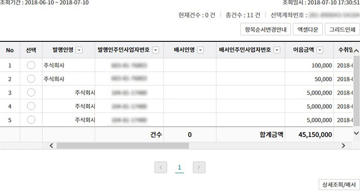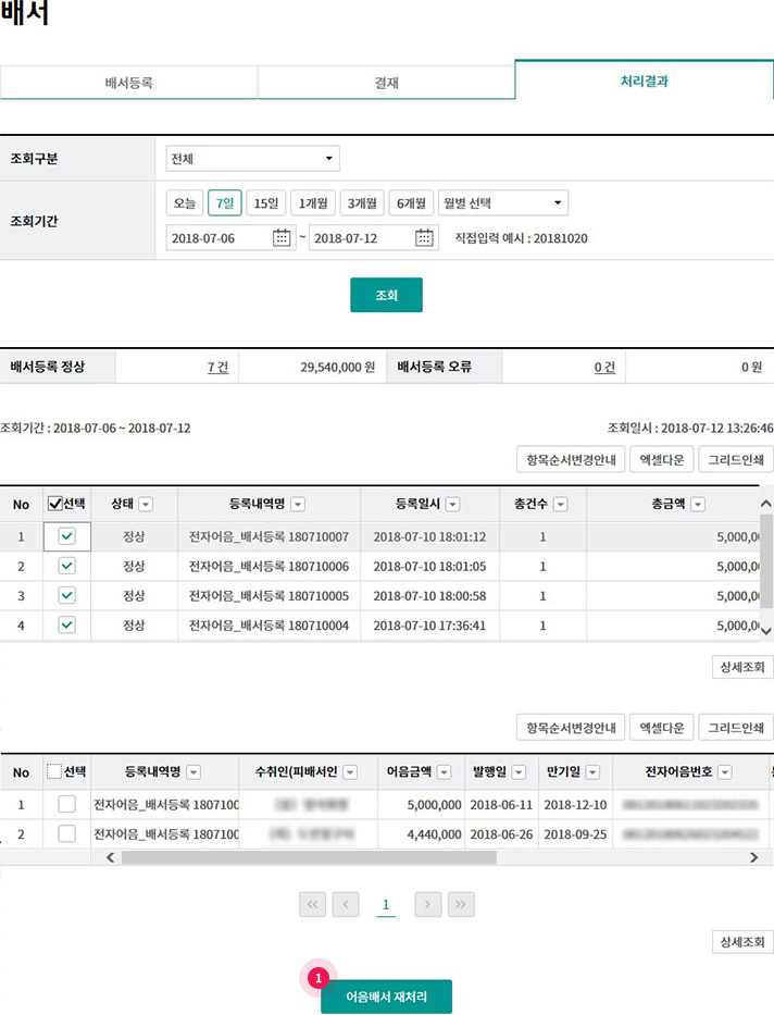 Step 9. 조회대상 건을 선택하고 상세조회, 어음배서 재처리 중 원하시는 거래를 선택합니다.