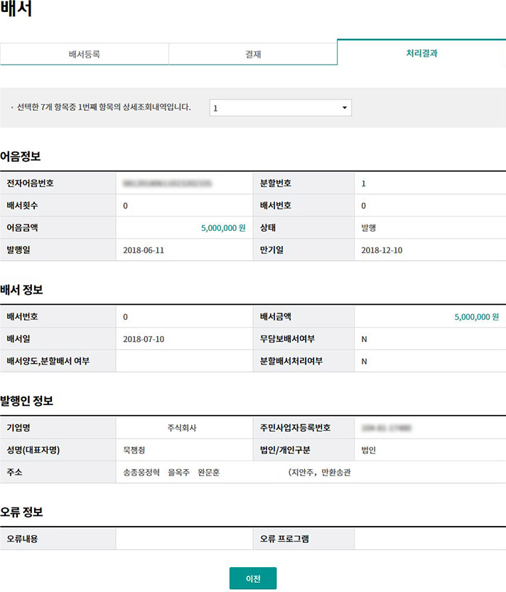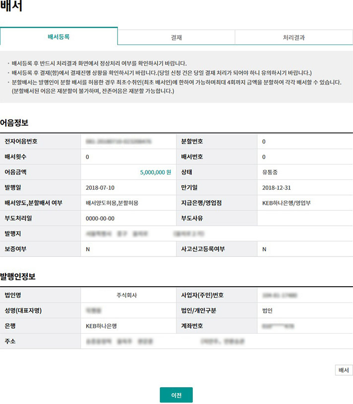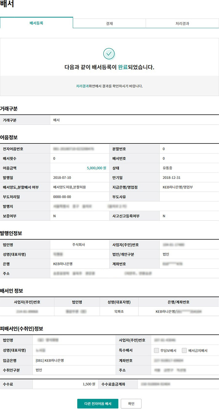Step 6. 배서등록완료 화면 입니다.