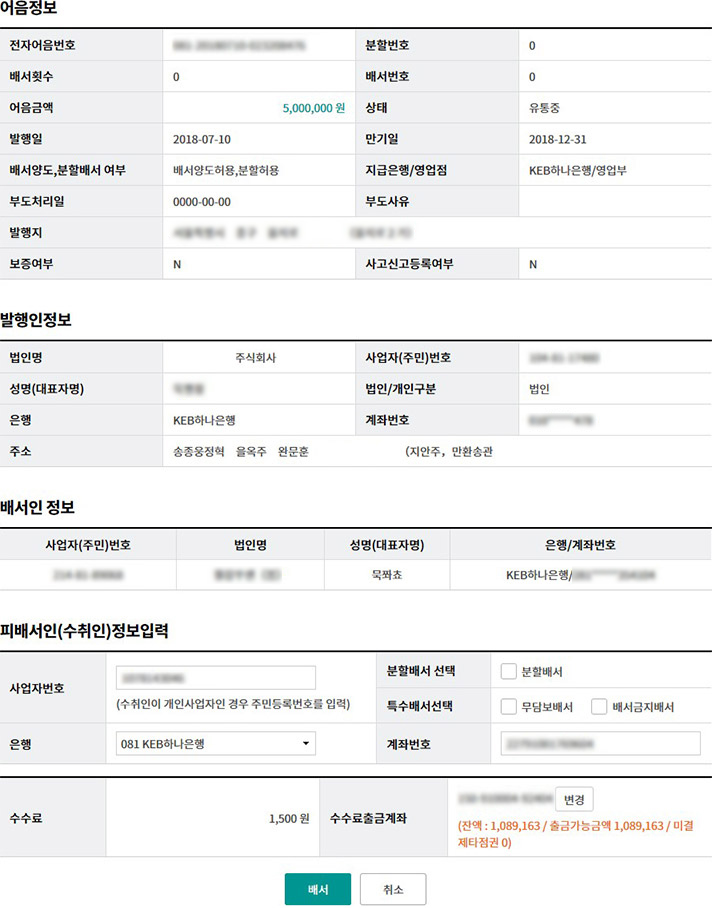 Step 4. 피배서인(수취인) 정보입력 및 필요시 수수료출금계좌를 변경하고 배서 버튼을 클릭합니다.