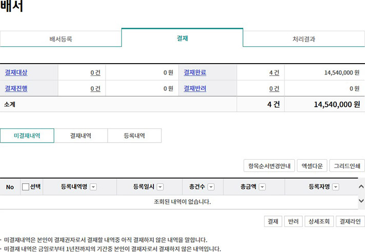 Step 7. 미결재내역, 결재내역, 등록내역 중 원하는 거래를 클릭합니다. (단독사용자의 경우, 해당없음)