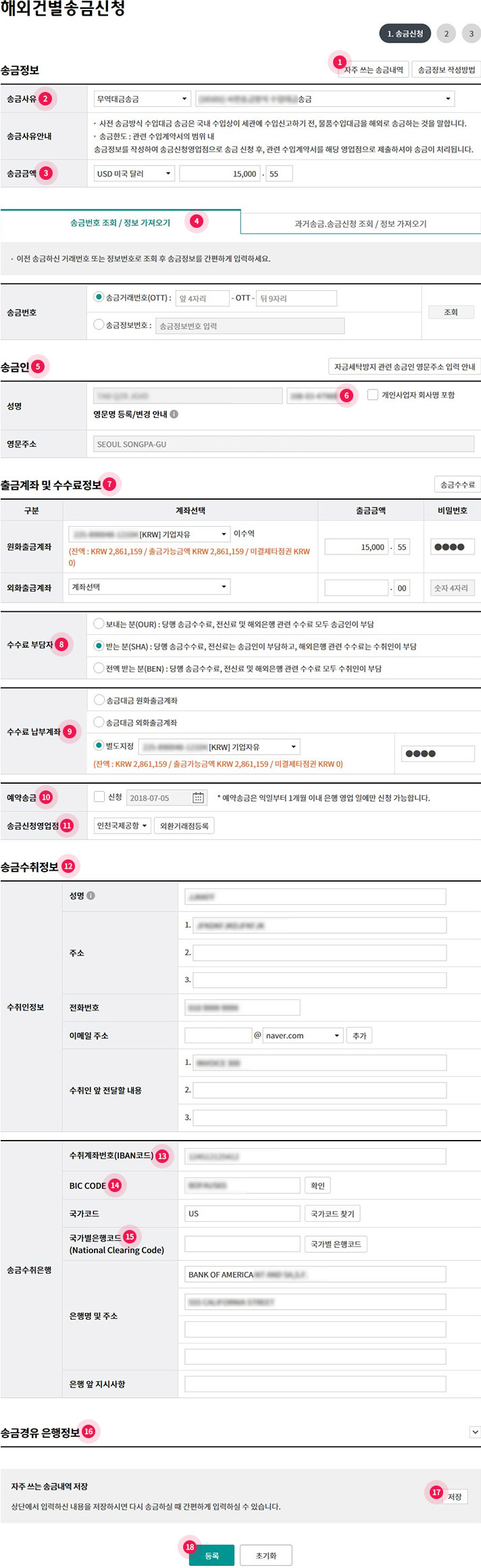 • ⑬ 수취계좌번호 또는 국가에 따라서 필요한 IBAN 코드를 입력합니다.