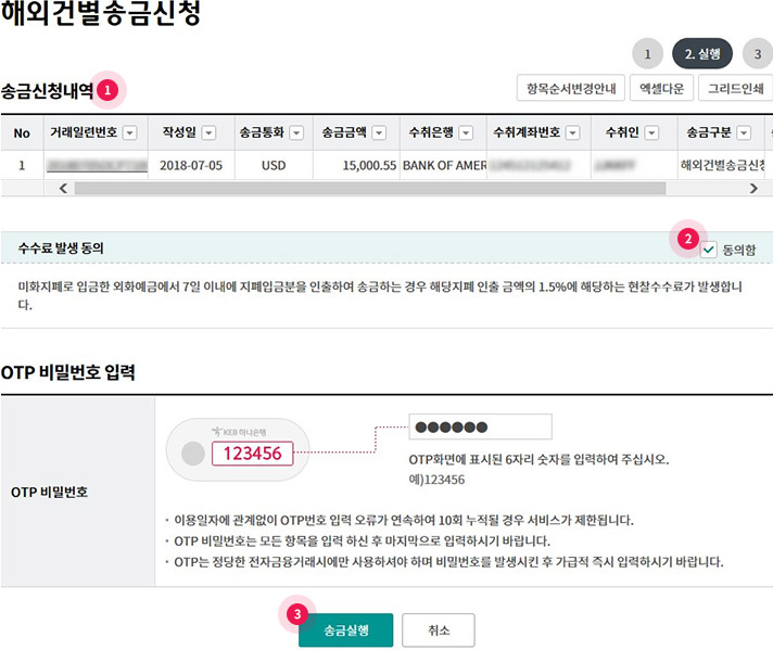 Step 2. 송금신청내용을 확인한 후 송금실행을 신청합니다.
