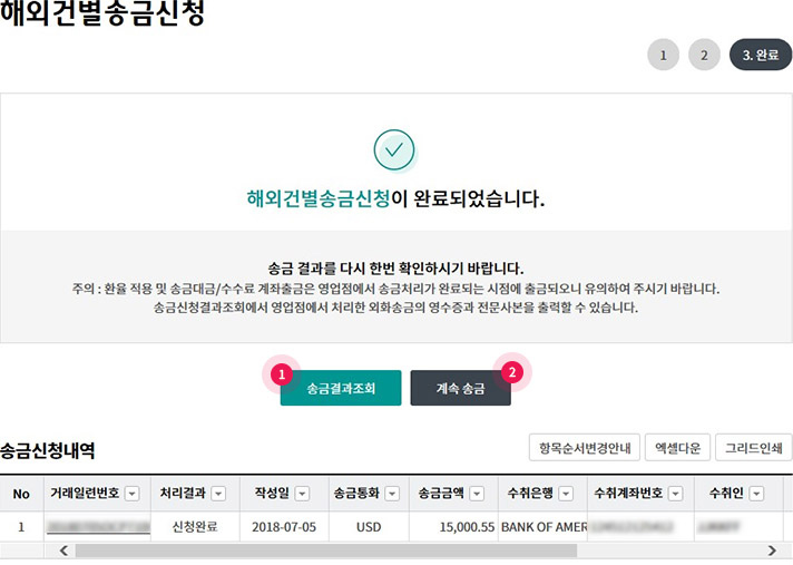 • ① 송금신청결과조회에서 상태를 확인합니다. 신청영업점으로 증빙을 송부하고 신청서가 정상적으로 접수되었는지 확인합니다.