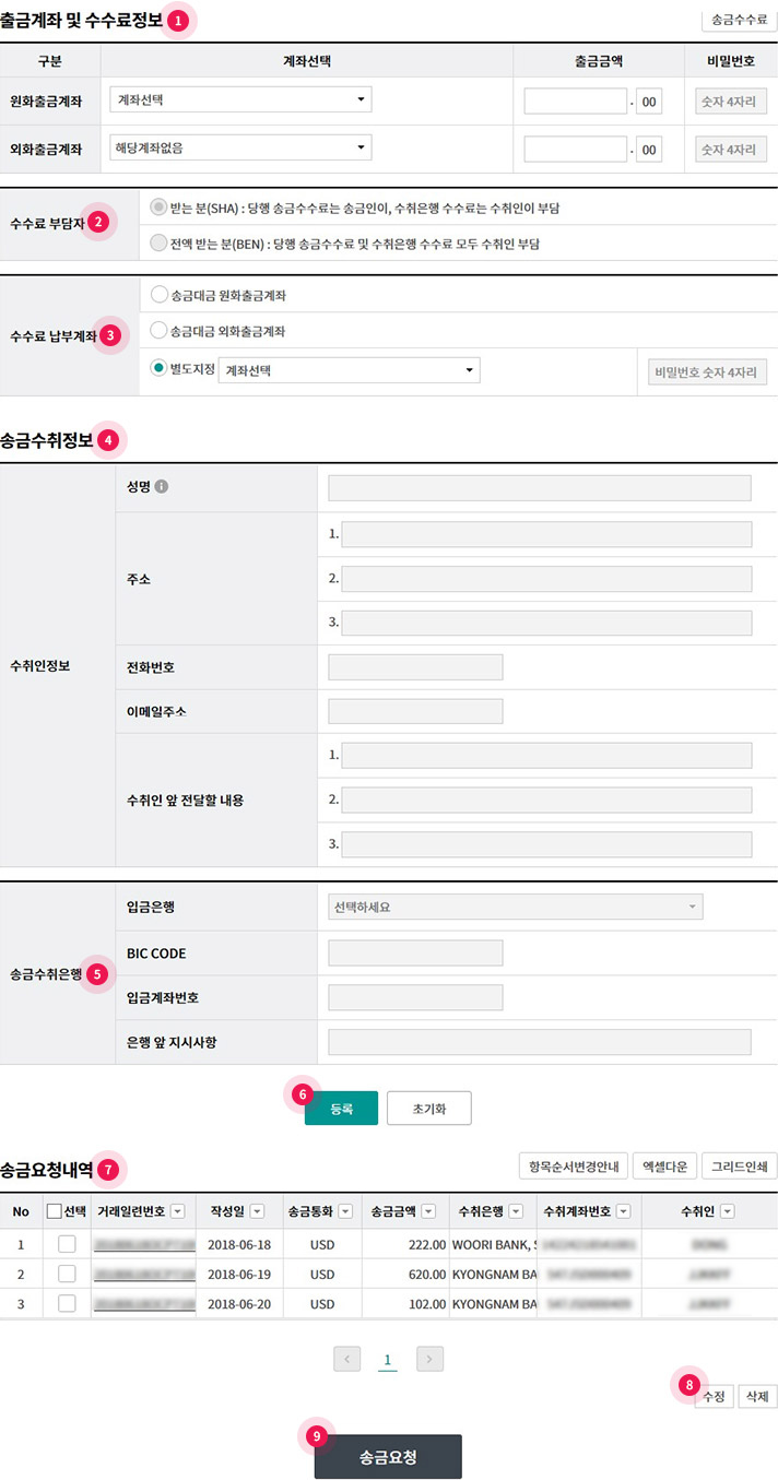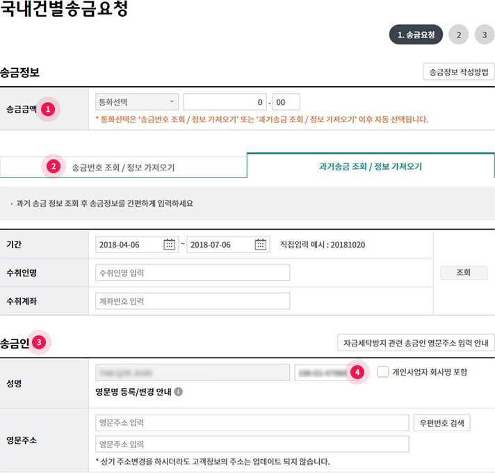 ② 송금정보번호 및 과거 송금정보를 불러와서 신청서를 작성합니다.
