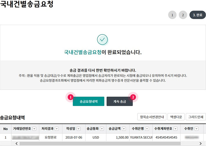 ① 송금신청결과조회에서 상태를 확인합니다. 요청이 완료되면 송금처리가 완료되므로 결과를 꼭 확인합니다.