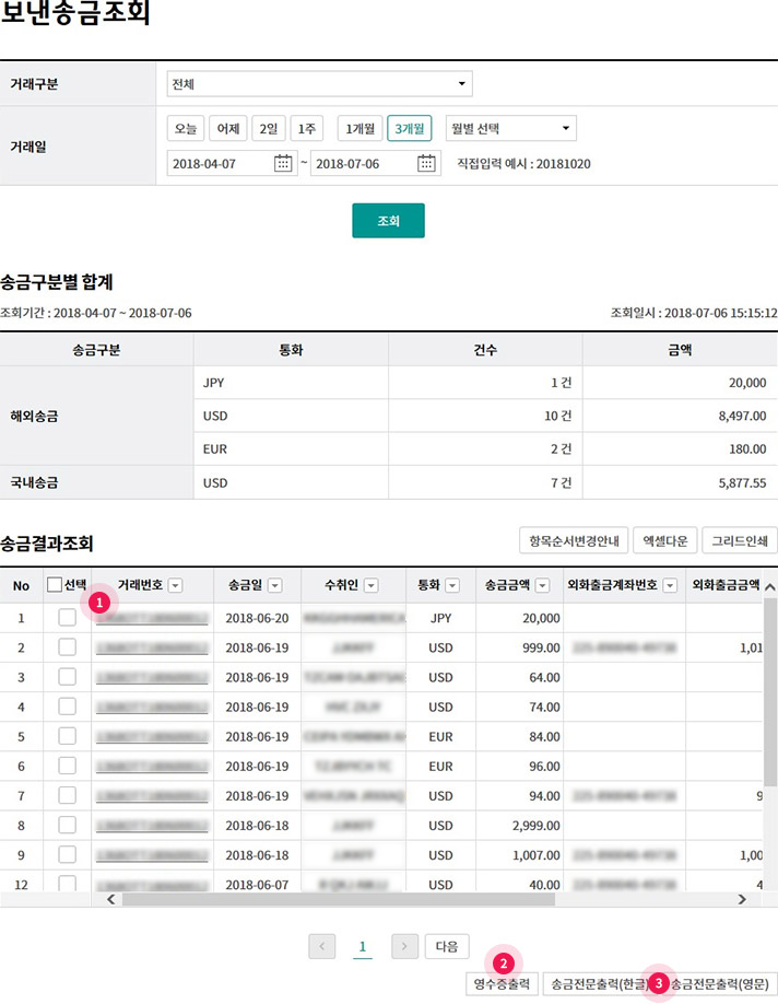 ③ 송금전문을 조회할 수 있습니다. (한글/영문)