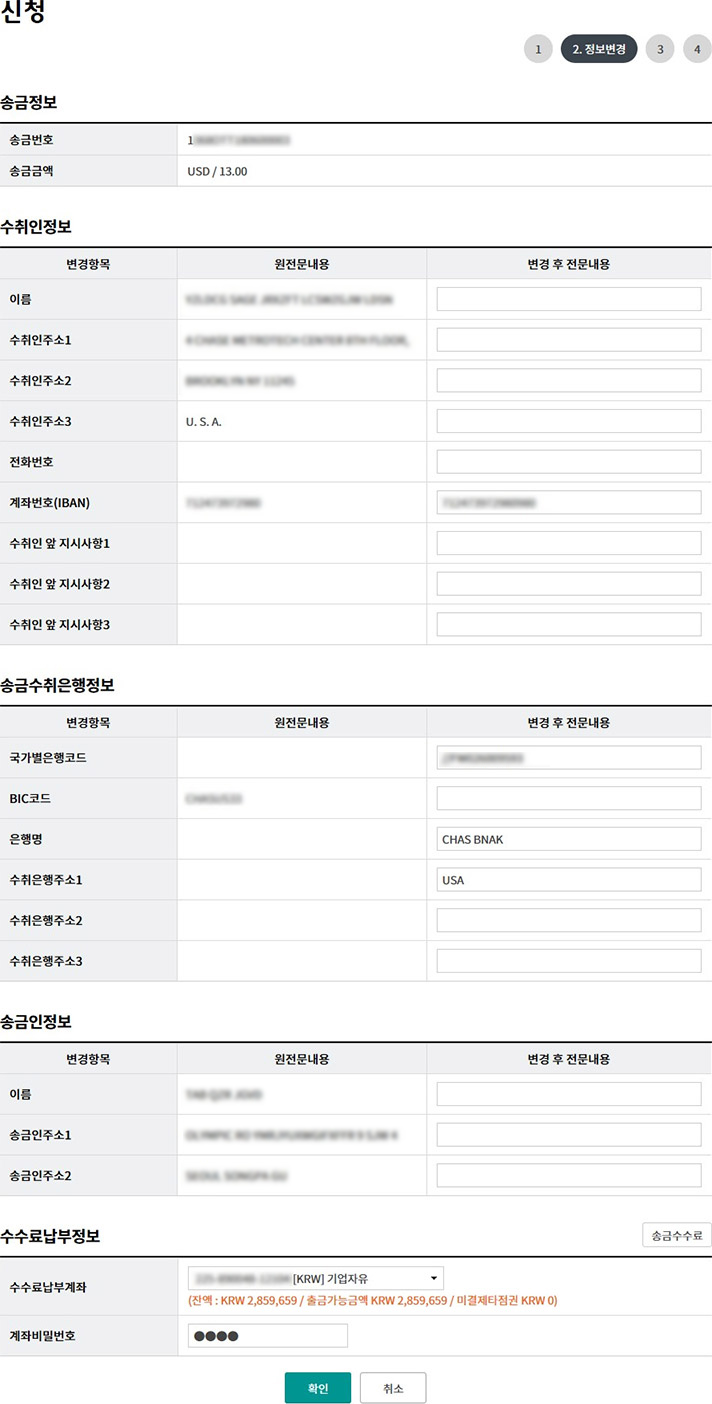 Step 1. 기업뱅킹을 통해 신청한 송금 중 변경이 필요한 경우 내용변경을 신청합니다.