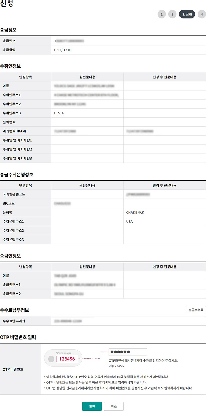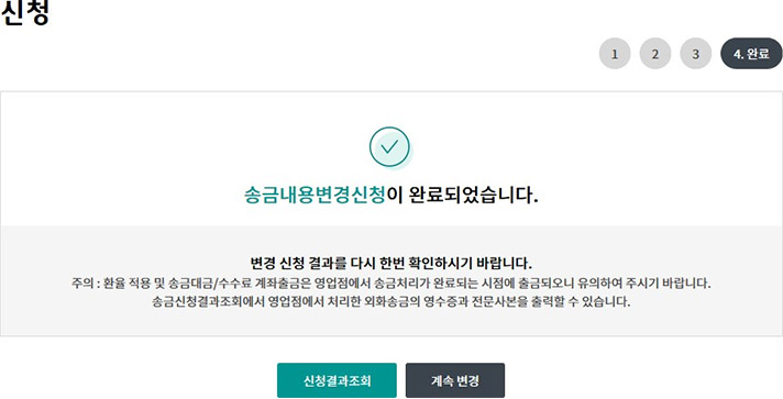 Step 4. 송금내용변경 신청이 완료되었습니다. (신청 영업점으로 신청서 접수여부를 확인 바랍니다.)