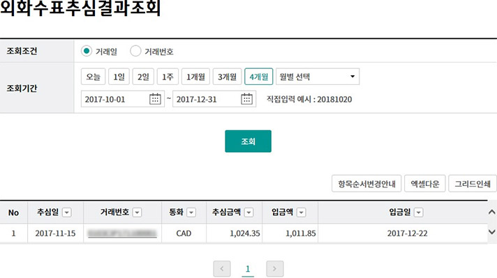 Step 2. 조회조건(거래번호), 조회기간 선택 후 조회 버튼을 클릭합니다.