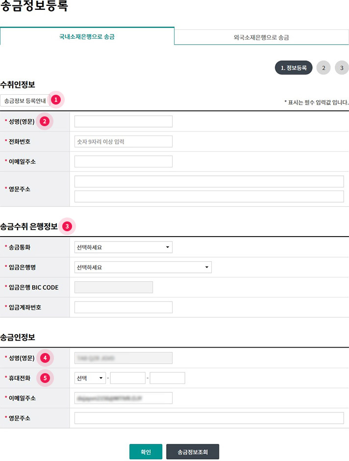 ⑤ 송금인 영문명은 영업점을 통해 사전에 등록되어야 있어야 합니다.