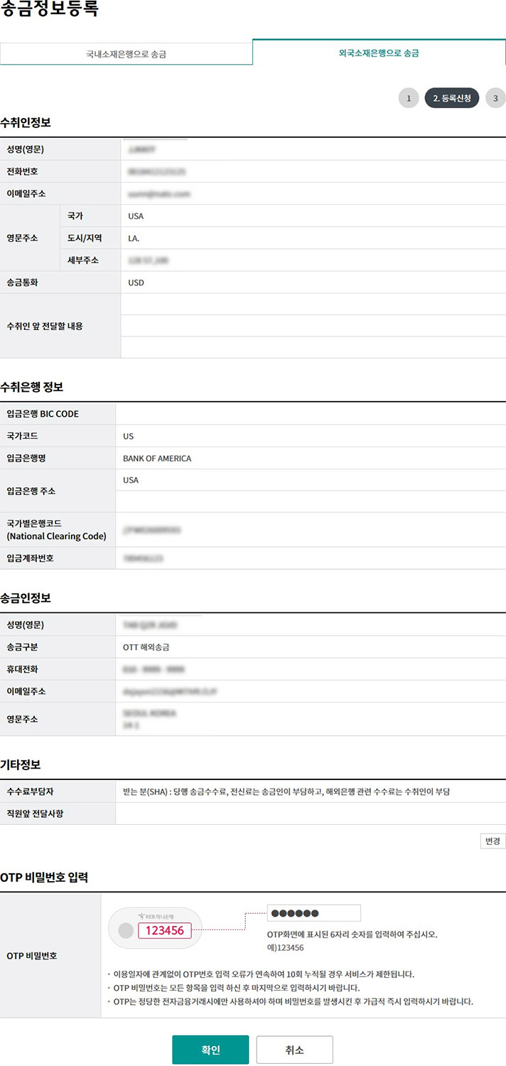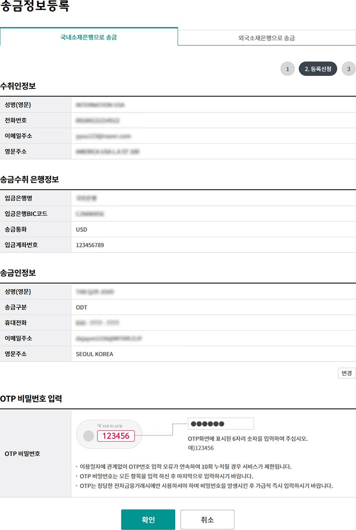 Step 2. 등록한 송금정보의 내용을 확인한 후 OTP 비밀번호를 입력합니다.