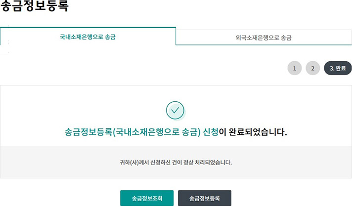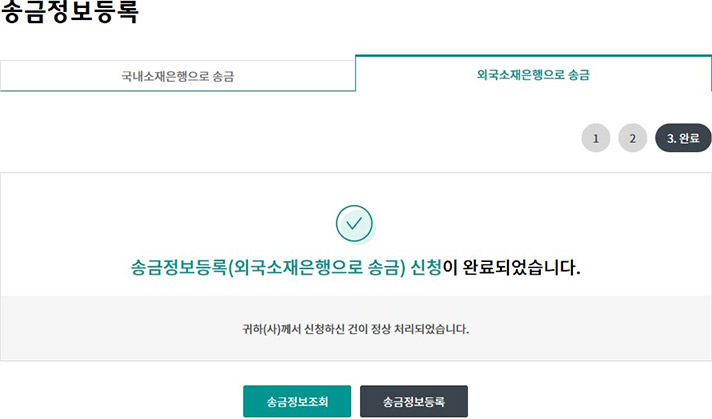 Step 3. 국내소재은행으로 송금하시는 송금정보 등록신청이 완료되었습니다.