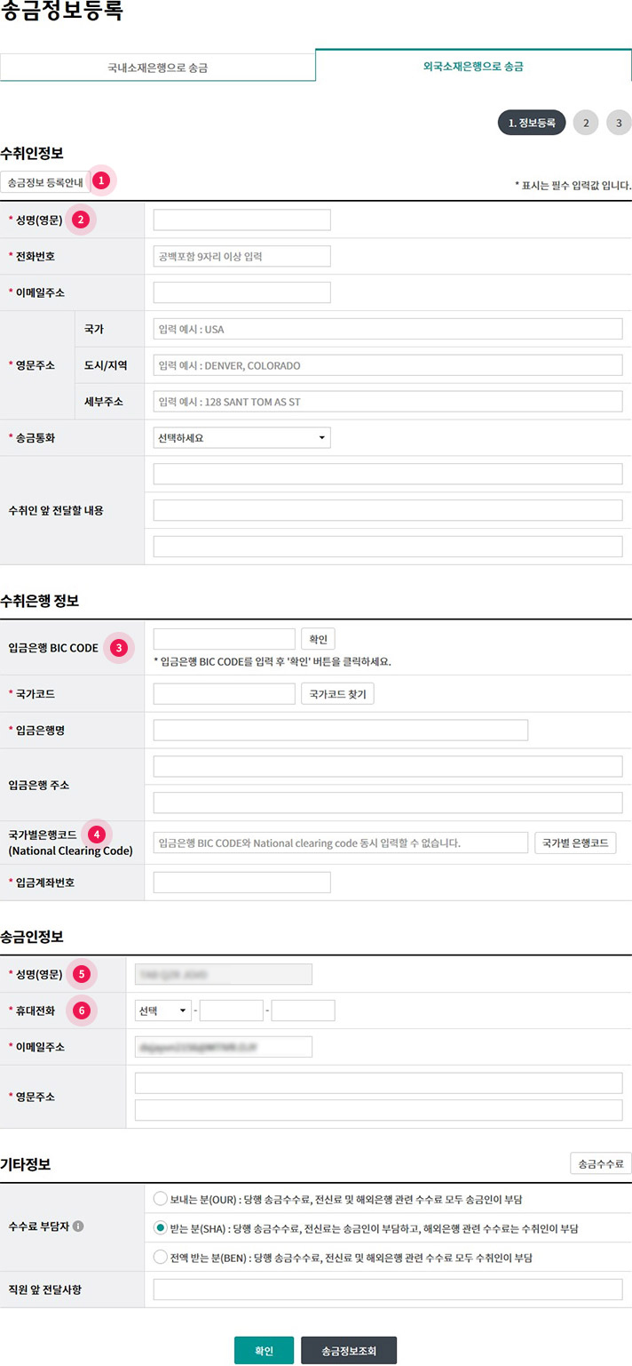 ② 수취인정보는 모두 필수입력항목입니다. (등록된 송금정보는 당행 외환상품지원부에서 내용을 검토한 후 승인됩니다.)