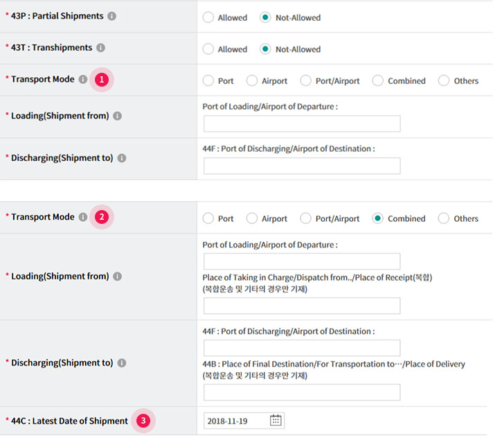 ② 복합운송수단을 선택하는 경우 수탁지, 도착지의 입력항목이 추가됩니다.