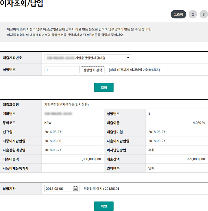 Step 1. 대출계좌를 선택한 후 조회버튼을 클릭 하고, 납입기간을 입력한 후 확인버튼을 클릭합니다.