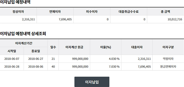 Step 2. 조회된 내역을 확인하고 이자납입 버튼을 클릭합니다.