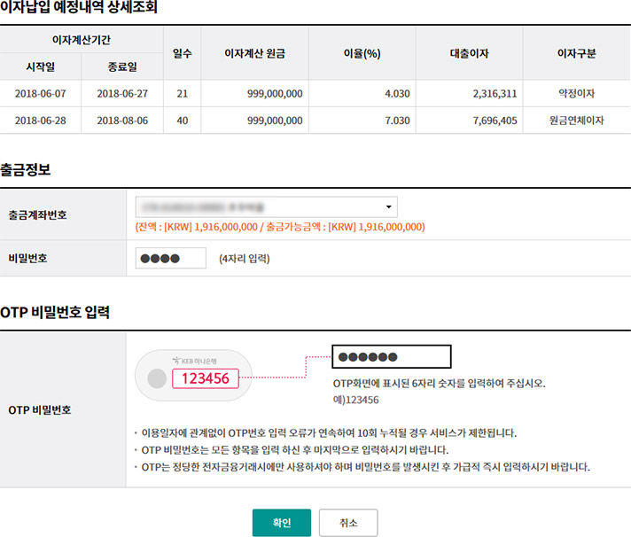 Step 3. 이자납입 내역을 확인한 후 OTP비밀번호와 인증서 암호를 입력합니다.