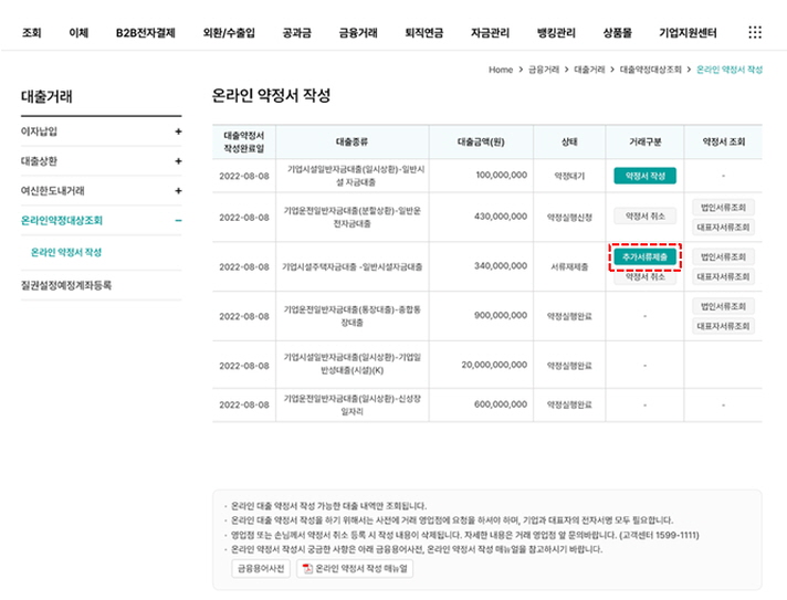 • ① [추가서류제출] 버튼을 클릭합니다.