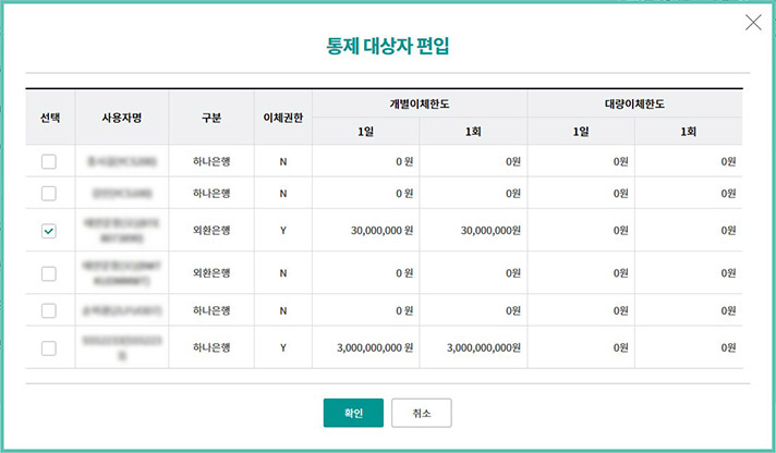 Step 2. 통제대상자로 편입하고자 하는 사용자를 선택한 후 확인버튼을 누릅니다.