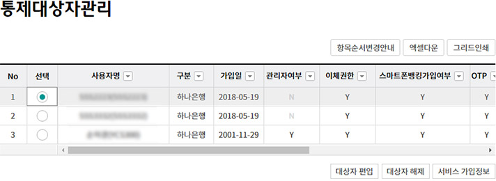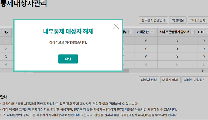 ③ 마스터사용자의 통제대상자에서 해제되는 사용자는 해제시점에 가지고 있는 출금계좌, 업무권한, 이체한도 등을 그대로 유지한 상태로 통제대상자에서 해제됩니다.