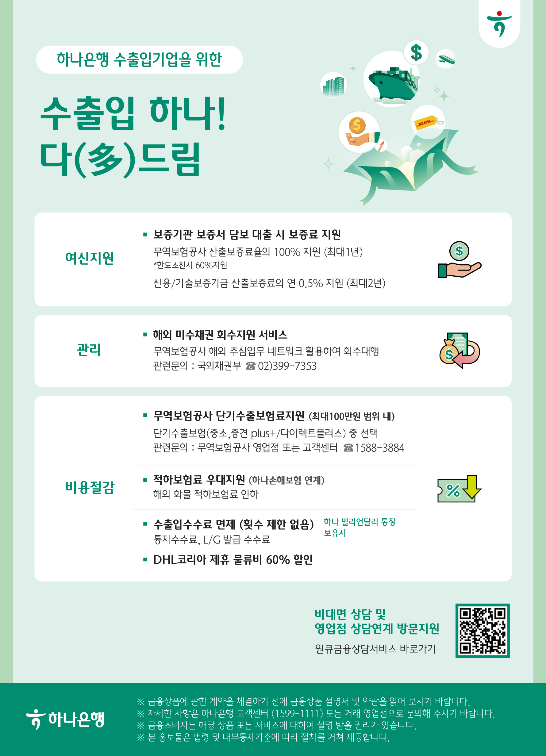 • 비용절감: 무역보험공사 단기수출보험료지원 (최대100만원 범위 내) 단기수출보험(중소,중견 plus+/다이렉트플러스) 중 선택, 관련문의: 무역보험공사 영업점 또는 고객센터 1588-3884 적하보험료 우대지원 (하나손해보험 연계) 해외 화물 적하보험료 인하 수출입수수료 면제 (횟수 제한 없음) 하나 빌리언달러 통장 보유시, 통지수수료, L/G 발급 수출입수수료 DHL코리아 제휴 물류비 60% 할인